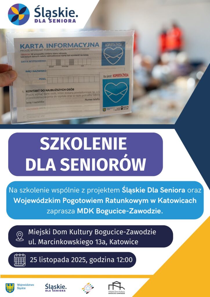 W ramach projektu Śląskie dla Seniora, Wojewódzkie Pogotwie Ratunkowe w Katowicach oraz MDK Bogucice-Zawodzie zapraszają na darmowe szkolenie dla seniorów. Ratownicy medyczni przeprowadzą zajęcia, podczas których uczestnicy dowiedzą się jak reagować w sytuacjach zagrożenia życia i zdrowia.